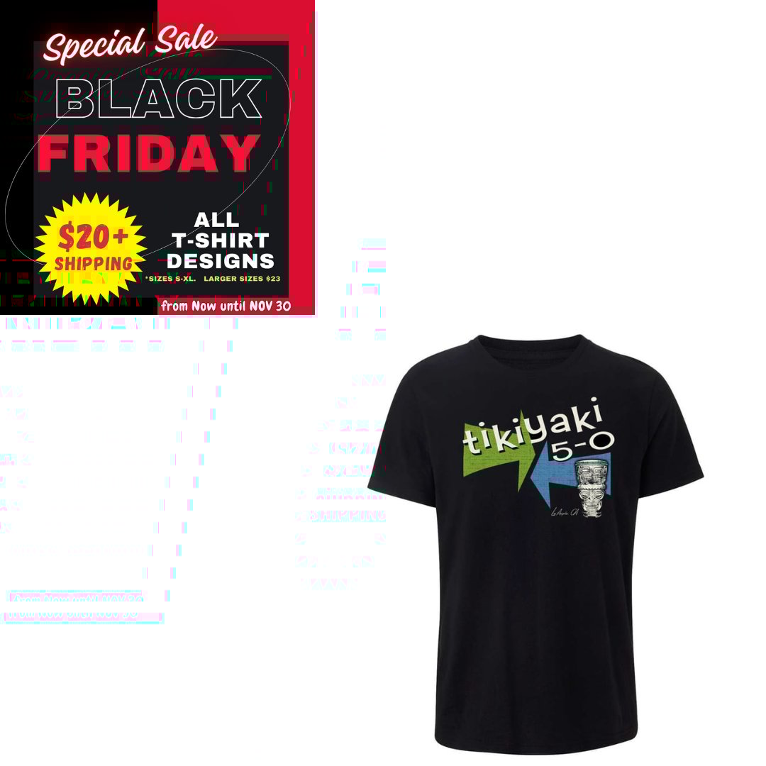 This super cool tee, printed with discharge ink (discharge ink actually dyes the color into the fabric rather than put a plastic based ink on top of it, which means no heavy ink feel on your shirt) features the Tikiyaki 5-0 logo, with Blue and green arrows, making this a bright, bold design.