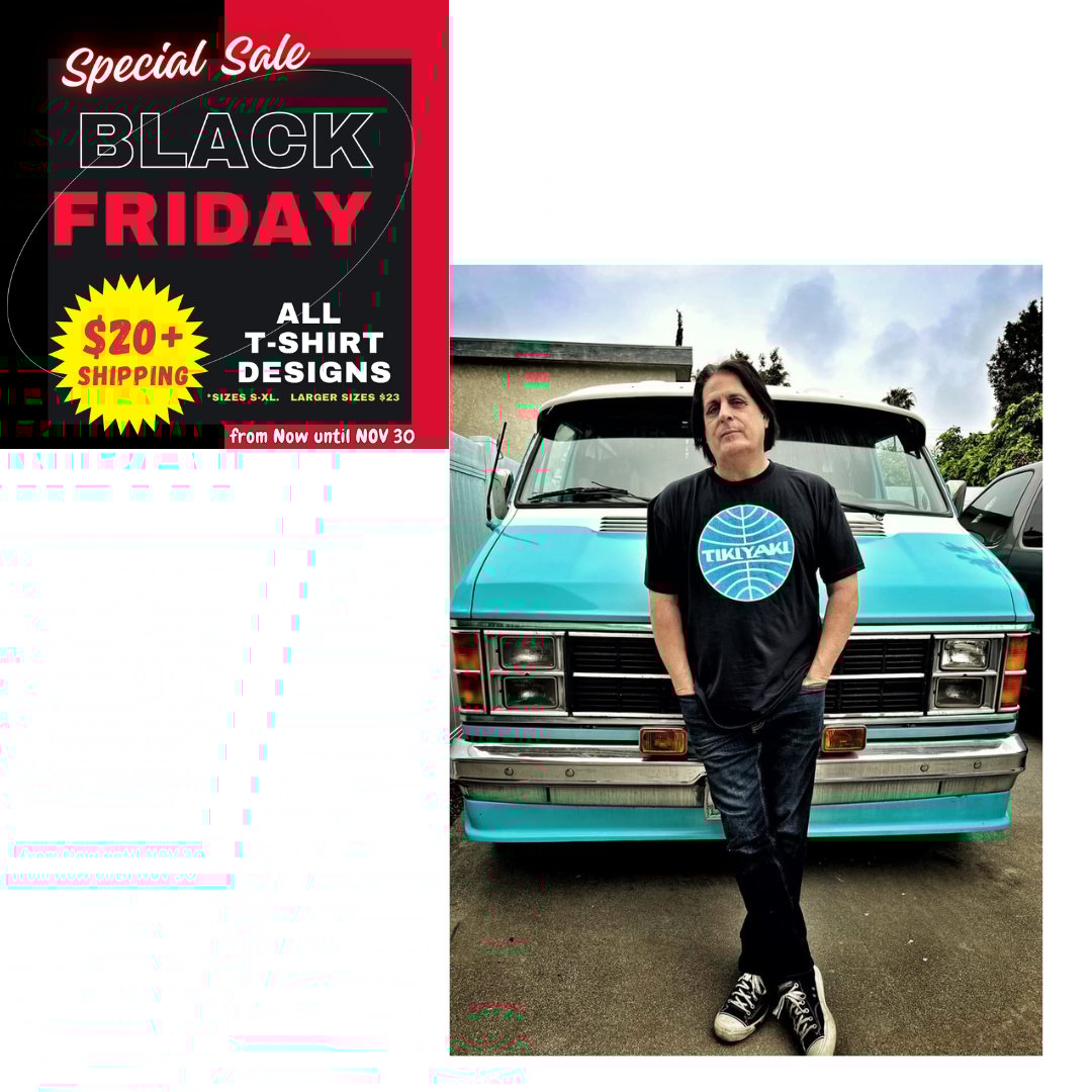 Tikiyaki Airways logo tee. Distressed vintage look print, blue and white on black. 100% soft, lightweight ring spun cotton.