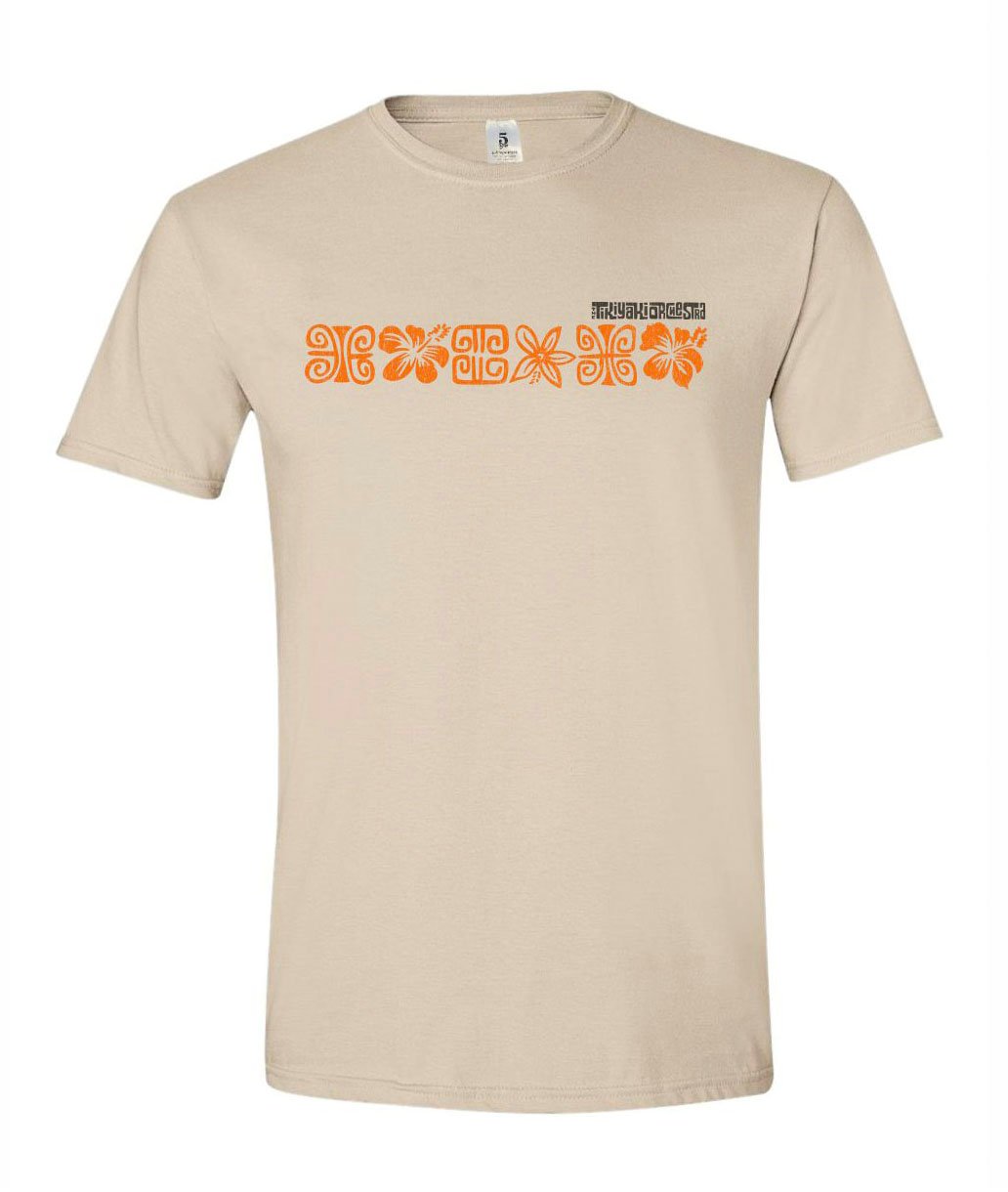 Super lightweight cotton, Sand with Orange and Espresso brown print. Front features a classic orange hawaiian tapa, with espresso brown logo crest print.