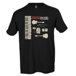 This super cool tee, printed with discharge ink (discharge ink actually dyes the color into the fabric rather than put a plastic based ink on top of it, which means no heavy ink feel on your shirt) features the striking instrument motif featured on the back of the "Idol Worship and other Primitive Pleasures" album.